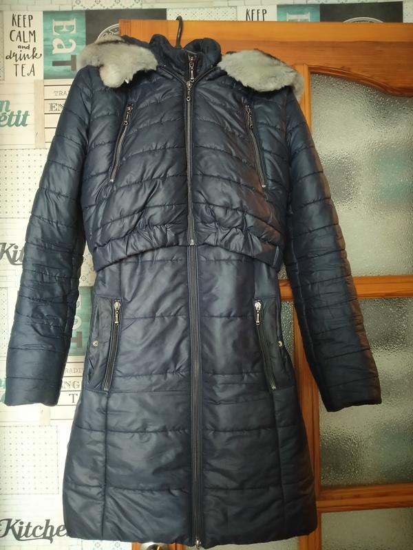 Красивое удобное пальто трансформер. Можно носить как зимой, так и весна-осень за счет того, что снимается теплая жилетка. Капюшон оформлен красивым воротником. Размер 42 (с-хс). Цвет темно-синий.