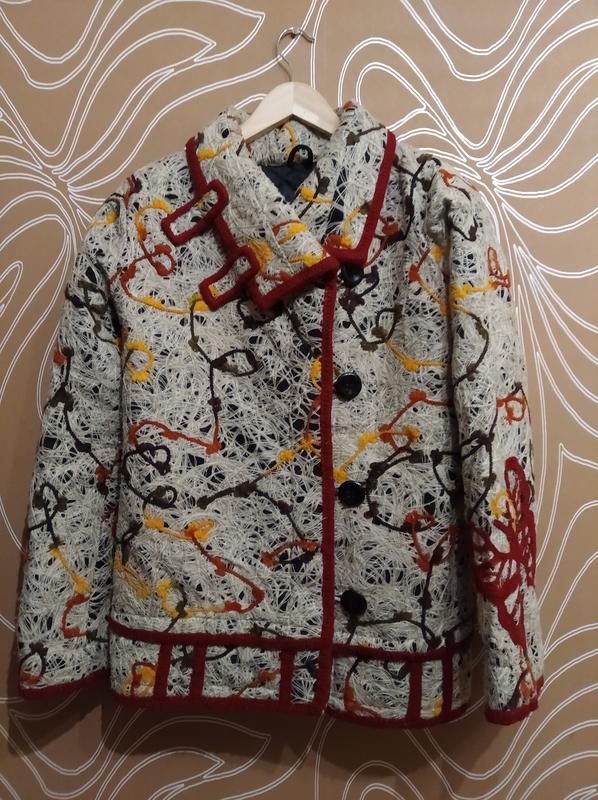 Очень красивое, необычное укороченное женское пальто Handmade. Шилось на заказ, одевалось раза два, в идеальном состоянии. Необычное переплетение нитей, оригинальный ворот и вышивка из ниток на одном из рукавов в виде бабочки. Обшито красной нитью, теплое, оригинальное, рукава к низу немного клёш. Замеры: плечи- 39 см ПОГ- 43 см ( от подмышки к подмышке) ПОТ- 44 см ПОБ и ширина низа - 48 см длина -63,5 см рукав- 59,5 см
