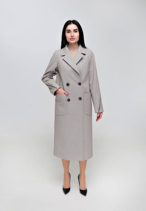 Пальто женское демисезонное, выполненное из шерстяной ткани свободного прямого силуэта. Изделие с отложным воротником с лацканами Рукава-втачные реглан, по диагонали рукав декорирован молнией Подкладка 100% нейлон Карманы-накладные Застежка двубортная на две пары пуговиц Длина рукава 65- 66 см Длина изделия по спинке 113 см