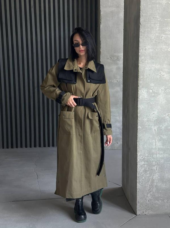 ▪️модель: 149 Тренч "Weekend" Стильный комбинированный тренч, из 100% коттона, ремни из основной ткани на кожаной основе. За счет рабочих кнопок можно регулировать высоту разреза ▪️размер: one size ▪️цвет: хаки ▪️ткань: котон Параметры модели: 85/65/90 Рост 167 см