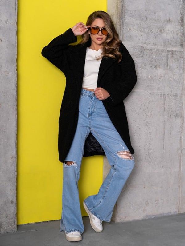 14270_черный Демисезонное пальто-кокон, выполненное из черного однотонного букле с нижним подкладом. Модель с карманами и длинными рукавами оснащена классическим воротником. Пальто на пуговице с длиной до колен.