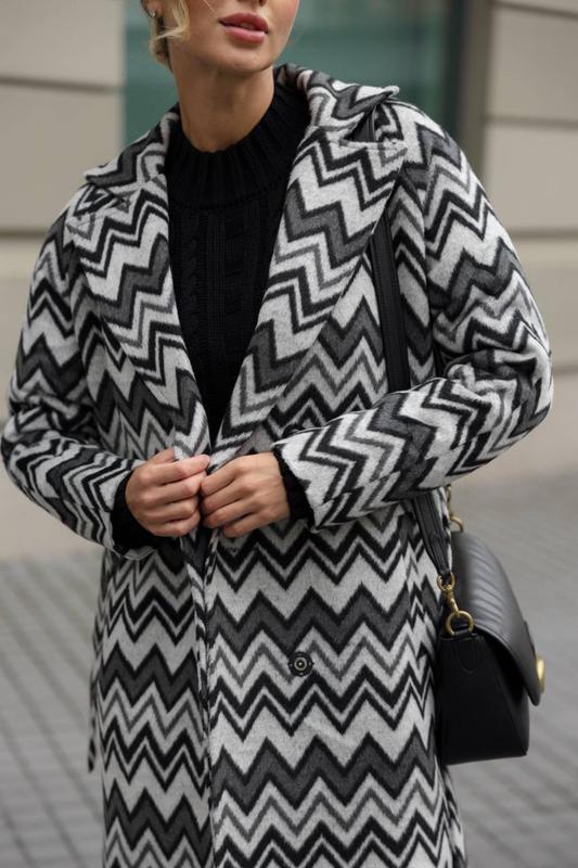 Coat in Zigzag print ▪️Fabriс: coat 20% wool 80% polyester + lining insulated with synthetic winterizer 150) ▪️ Pockets working, there are slots, there are buttons inside ▪️ Size: universal in smell ▪️ Color: gray