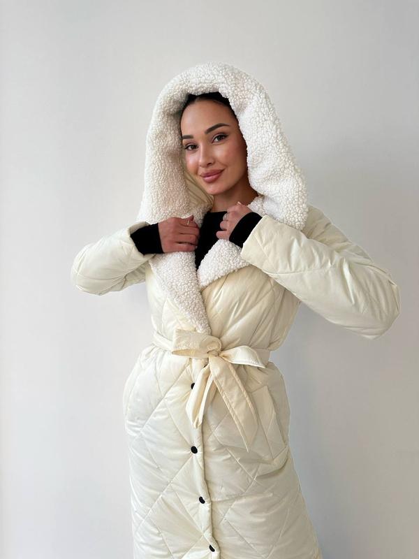 Новинка 2023р 💥 Женское стеганое зимнее пальто с меховым воротником ( мех искусственный). Пальто приталенное с поясом, по бокам два кармана, застегивается на кнопки. ❄️Пальто с капюшоном зима # 45❄️ ( декоровано штучним хутром ) 🔹Ткань плащевка 🔹Утеплитель силикон ( плотность 250 ) 🔹Размеры : S (42-44), M (44-46), L ( 46-48) 🔹Цвета: белый ( молочный), черный, бежевый 📌 Замеры по изделию ( запас 10-12 см от замеров по телу) 🔹S(42-44) : длина пальто - 108 см, длина рукава - 62 см, объем груди - 98, талия - 94, бедра - 108 см 🔹 М (44-46) : длина пальто - 110 см, длина рукава 63 см, объем груди - 106, талия - 100 см, бедра - 112 🔹 L (46-48): длина пальто - 112 см, длина рукава 64 см, объем груди - 114 см, талия - 106 см, бедра - 116 см