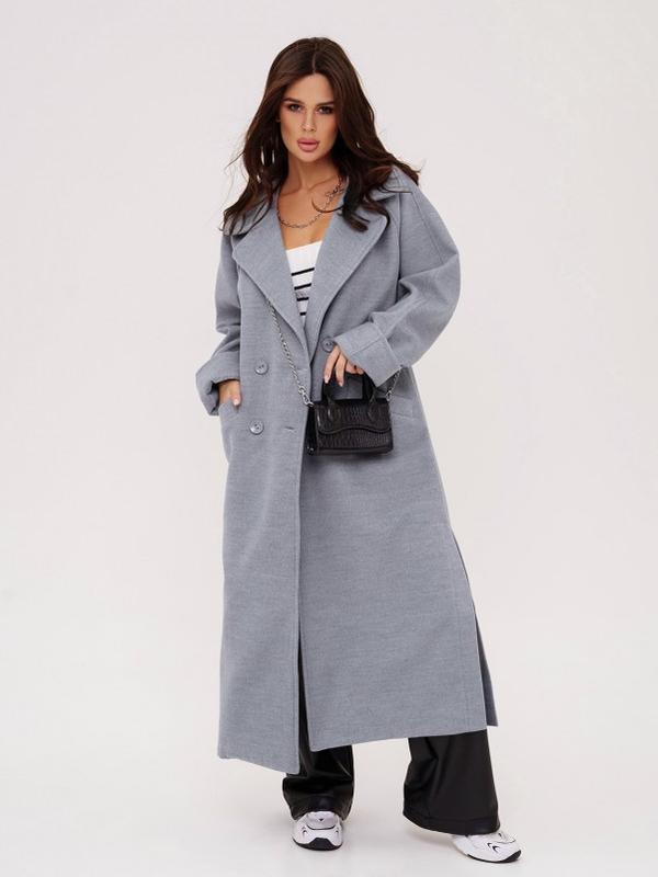 13549_серый Десезонное пальто со свободным кроем выполнено из серого кашемира без подклада. Пальто оснащено карманами и симметричными разрезами. Модель на пуговицах с воротником и длинными рукавами реглан.