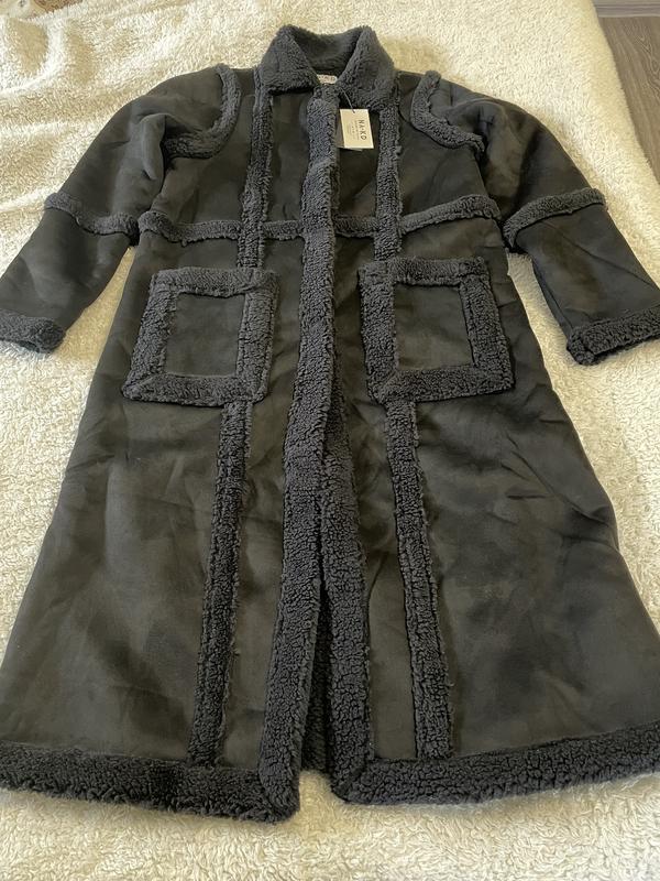 Это пальто изготовлено из полиэстера, имеет длинные рукава, передние карманы, застежку на пуговицах, плюшевые детали и плюшевую подкладку.