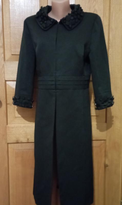 Стильное фирменное, коттоновое пальто украшено пуговицами, с яркой подкладкой, цвет насыщено черный, застегивается на пуговицы. Плечи 38, ПІГ 50, ПИТ 46, ПИБ 58, рукав 3/4-45, длина изделия 104, сзади разрез 40 см.