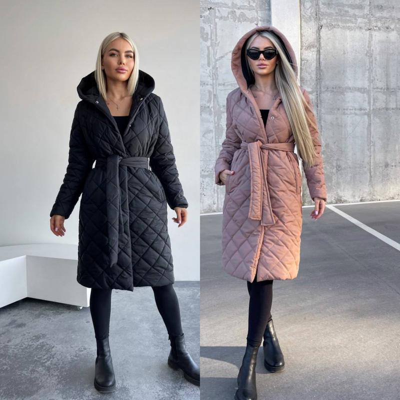 Стеганное демисезонное пальто из матовой плащевки на силиконе. с капюшоном и поясом р-ры 4...