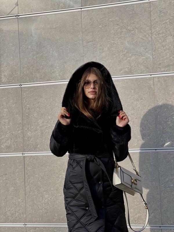 Зимнее комбинированное пальто с водоотталкивающей стеганой плащевки и искусственного меха Стильное зимнее пальто из новой коллекции. Любовь с первой секунды. Комбинация плащевой ткани и эко меха премиального качества.. Оптимальная длина 117 см, пояс в комплекте. С нашей новинкой тебе обеспечена красивая, стильная и теплая зима. Цвет: черний Характеристики: - прямой силуэт - двубортная застежка на кнопки - два боковых кармана - пояс в комплекте - на подкладке - утеплитель - силикон Параметры: - Рост модели на фото: 172 см - Размер изделия на фото: 44 ( S) - Длина изделия по спинке: 117 см Жмите на кнопки, чтобы увидеть все модели и отзывы о нашей работе.