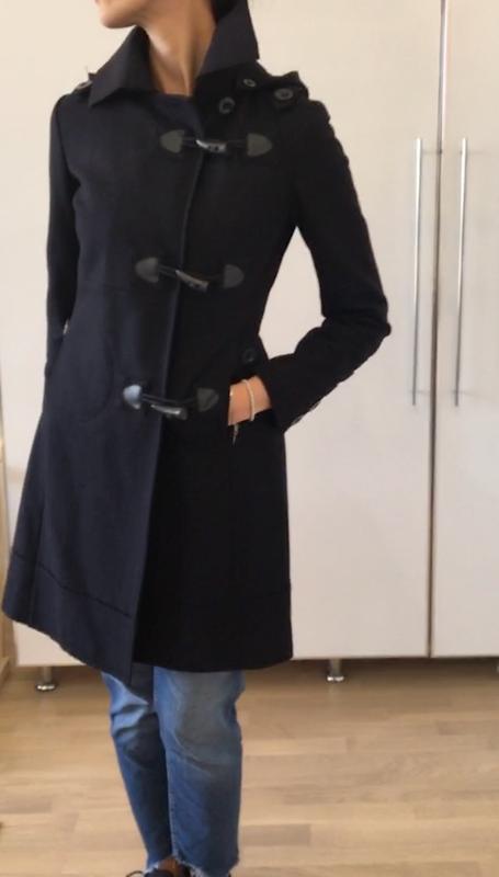 Очень стильное пальто темно синего цвета. 58% шерсть. Интересный фасон, пристегивается капюшон, подкладка тоже интересная. Красиво смотрится и с джинсамии и с юбкой. Состояние идеальное. Мой рост - 175 см.
