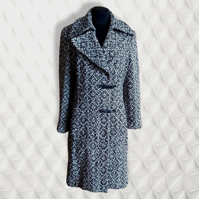MARC CAIN N5 Черное кремовое твидовое пальто средней длины с узором «гусиные лапки» На картинке указаны стандартные размеры бренда, сверяйте со своими мерками. Б/у состояние,, смотрите фото, край одного рукава с незаметным небольшим пятном, на подкладочной ткани не большой надрыв, верхний слой застежки имеет следы потертертости