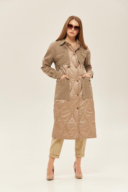Девочки!!! Перед заказом: убедитесь, пожалуйста, в наличии нужного цвета и наличия любым удобным для Вас способом. Будем благодарны, если в комментарии вы будете указывать цвет, который вам нужен, и ваши замеры по обхвату груди, талии, бедер и рост. Демисезонный плащ-пальто: Выполнен из стеганой плащевки с джинсовой отделкой. Холода не страшны! Ведь модель утеплена силиконом. Демисезонный плащ из стеганой плащевой ткани с отделкой из джинсы. Характеристики: -- прямой силуэт -- отложной воротник -- спущенная пройма -- накладной карман -- застежка на кнопки -- утеплитель силикон Состав: верх: 100 % полиэстер отделка : 100 % коттон подкладка: 100% вискоза утеплитель: 100% полиэстер Параметры: рост модели на фото : 176 см. длина изделия по спинке:113 см длина рукава от ворота: 71 см на фото изделие в размере 44 (S)