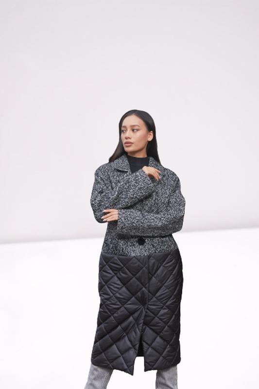 !!! Перед заказом: убедитесь, пожалуйста, в наличии нужного цвета и наличия любым удобным для Вас способом. Будем благодарны !!! Модель представлена в сером и черном цвете. Оригинальное сочетание тканей и фактур придаст изюминку вашему осеннему образу. Пальто хорошо сочетается с одеждой и обувью в разных стилях. Стильный фасон оверсайз, базовые цвета, свободный крой и комфортная длина -- всё это сочетается в новом пальто. Демисезонное комбинированное пальто из пальтовой и плащевой тканей. Характеристики: -- прямой силуэт слегка заужен к низу -- спущенный рукав -- английский воротник -- центральная застежка на пуговицы -- нижняя часть утеплена на силикон -- на подкладке Состав: верхняя часть: 40% шерсть, 60 % вискозы нижняя часть: 100% полиэстер Параметры: Размер на фото: 44 Длина изделия: 111 см