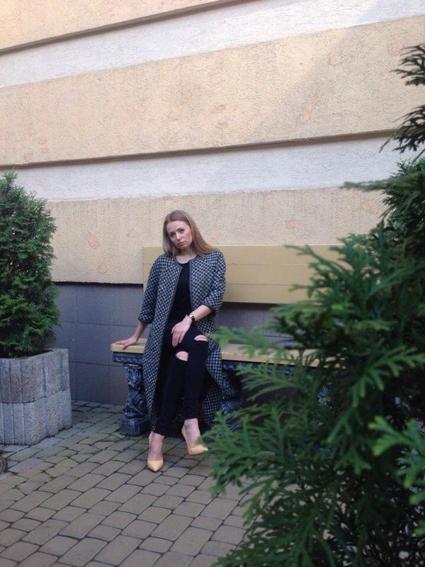 Элегантное стильное пальто.Дизайнерская вещь,эксклюзивно.Пальто на пдкладке,без застежки.Прямого силуэта,кант кожа.Рукав три четверти.