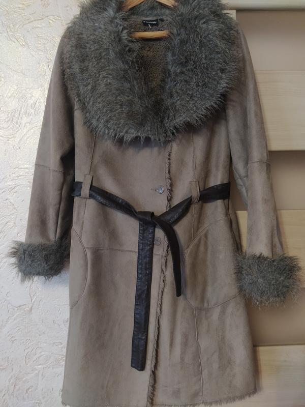 Светлое пальто -дубоенка с меховым воротником,мех искусственный
