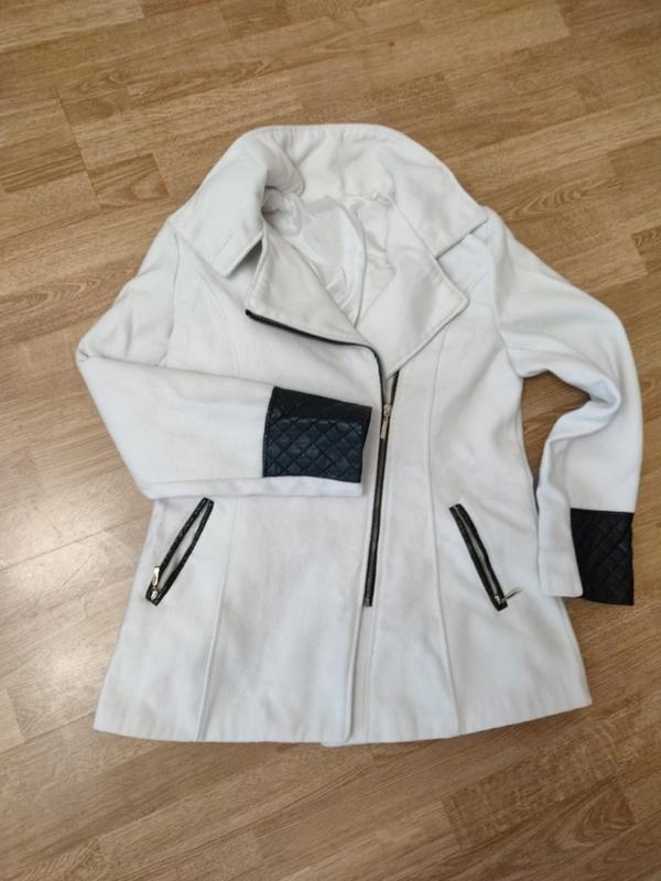 пальто белое со вставками под кожу на рукавчиках Застегивается на молнию (накосо). По вороту имеет пуговицы,можно сделать воротничок - стека,или классический Кармашки тоже застегиваются на молнию