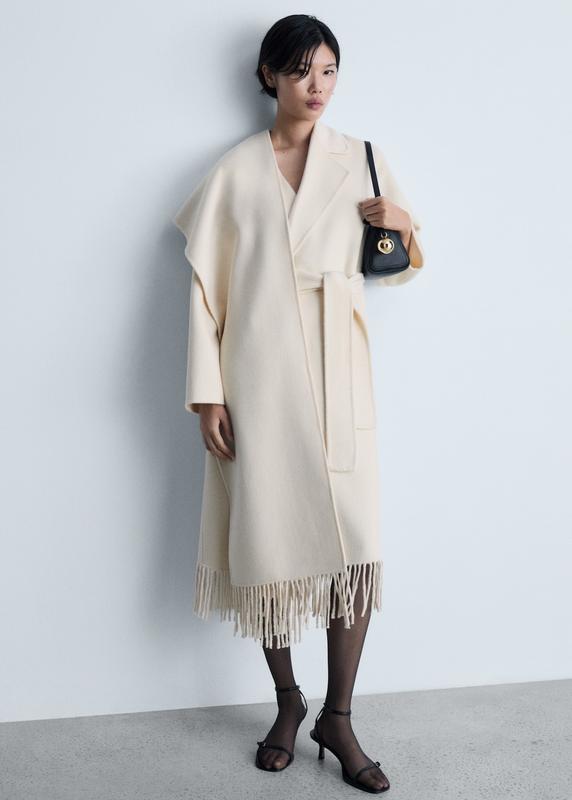 Цена 10130 77027689-WESTERN-LM Ткань из смеси шерсти. Огромный дизайн. Длинный дизайн. V-образный вырез с отворотом. Длинный рукав. Съемный шарф. Завязка на талии. Отделка бахромой. Заднее отверстие внизу.