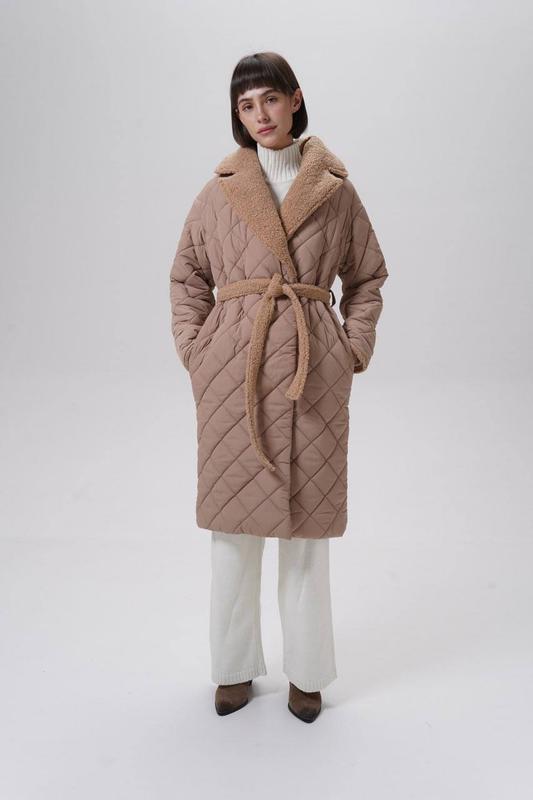 Теплое стеганое пальто с меховым воротником капюшоном, пальто на осень зима с поясом, тепл...