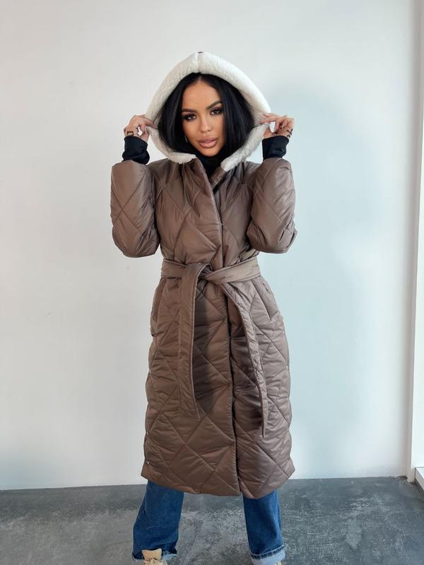 Модель 30873 Пальто зимнее Плащевка стеганая, синтепон 250, эко-мех Пальто с капюшоном, молния двусторонняя, пояс в комплекте Манжет перчатка Пальто на молнии и кнопках Длина 120см Рукав 74см от горловины По бокам кнопки для удобства Размер 42-44, 46-48, 50-52, 54-56 Цвет черный, шоколад, беж