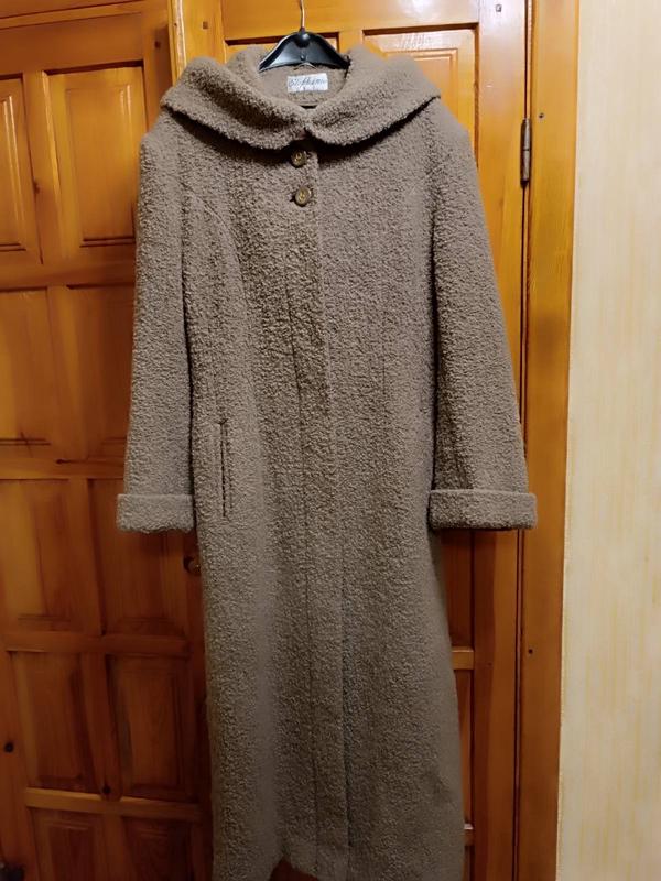 Пальто демисезонное с капюшоном и шлицей. Цвет капучино, ткань букле, размер 44 -46, длина от воротника 130 см. Длина рукава регулируется за счет манжета, есть карманы, подкладка атлас.