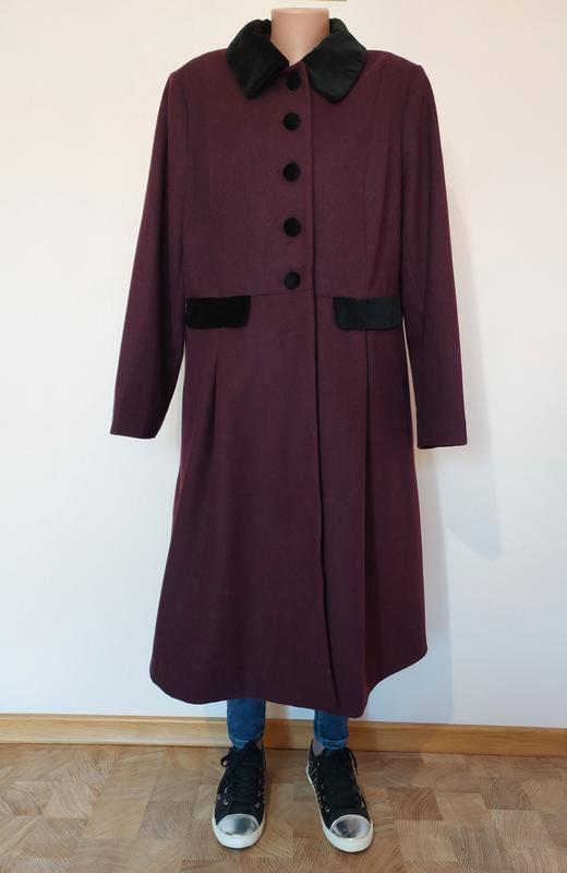 Качественное новое пальто 54-56 размера, в составе ткани 43% шерсти. По длине 112 см, обхват груди 125, талия 110, бедра 140, в плечах 45, рукав от плеча 63 см. Изделие украшено черными вставками из велюра, пуговицы также такие