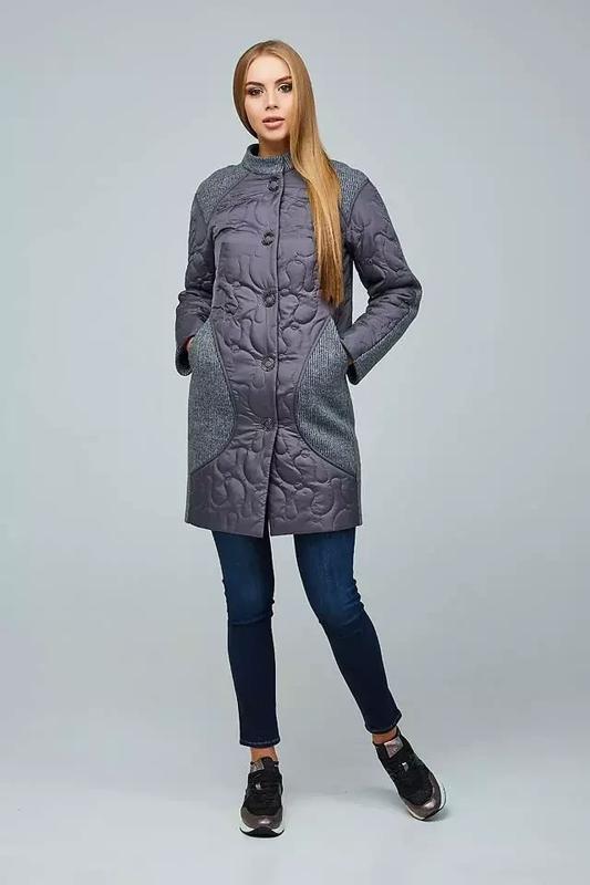 Пальто женское демисезонное, выполненное из стеганной плащевой ткани и трикотажа, прямого силуэта, зауженное к низу Изделие с подкладкой, воротник стойка. Спинка-трикотажное полотно Пальто декорировано вставками из отделочной ткани- трикотаж Карманы –в рельефах полочек Застежка однобортная на одну пришивную кнопку и пять пробивных кнопок. Длина рукава 64-65 см Длина изделия по спинке 88 см