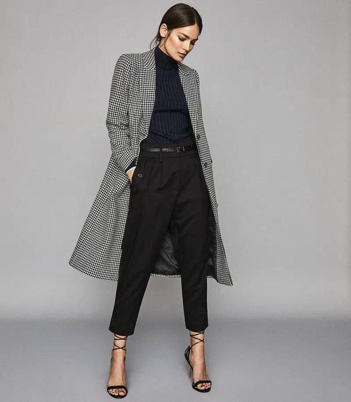 Женское шерстяное пальто от Reiss модель Lara. С неизменным принтом лапка. Модель средней длины. Имеет тонкие лацканы и однобортный силуэт. Состав 70% шерсти 30% полиамид. Подклад 100% вискоза. Два кармана по бокам. Сзади разрез. Состояние очень красивое. Замеры: Длина спереди от лацкана 100см Длина спинки 114 см Подмышками 52см Низ 61см Рукав от плеча 61 см