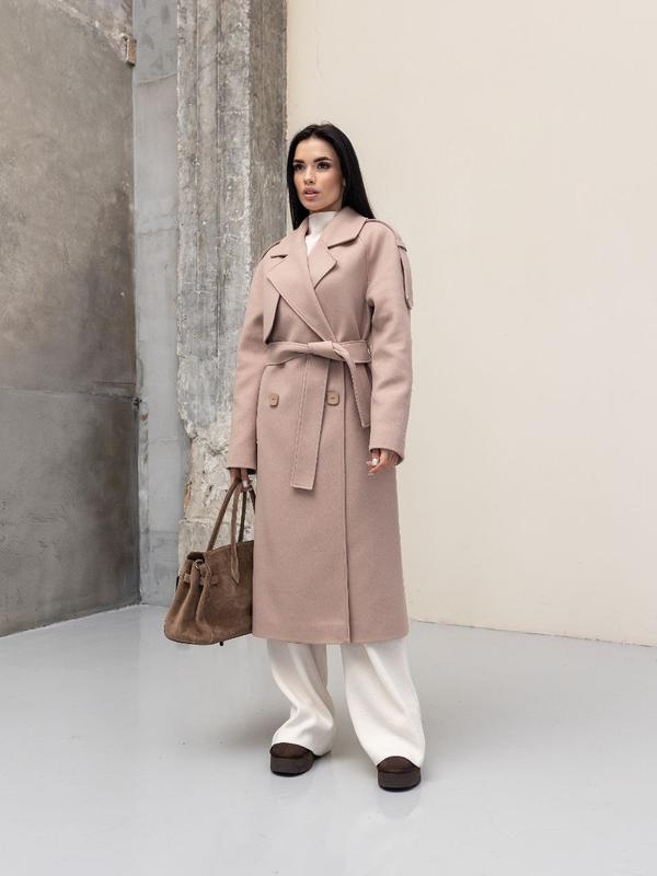 Пальто женское полушерсть двубортное с поясом весна осень цвет латте