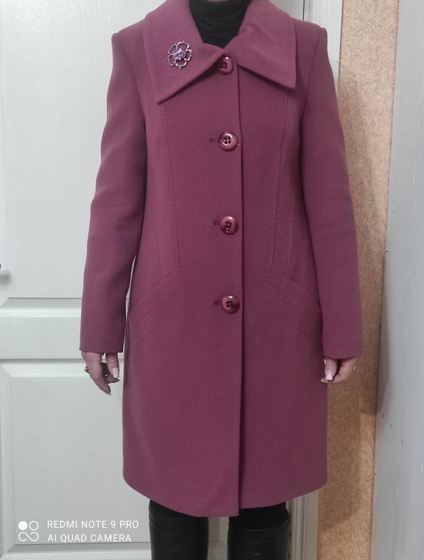 Демисезонное кашемировое пальто ягодного цвета полуприталенного кроя, интересный воротник, декорированный брошью, два рабочих кармана, декоративная выстрочка по рельефам, сзади встречный разрез-шлица. Брошь снимается ПОГ 49 ПОТ 44 ПОБ 55 Длина 99