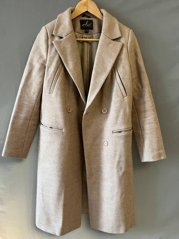 Пальто от бренда Elvi прямого кроя, чуть ниже колена. Цвет кемел/песочный с орнаментом мелкая елка. Ткань с содержанием шерсти, немного колется, не тонкая. Пальто теплое, подойдет на прохладную весну/осень. Длина по спине 96см Длина рукава 58см Обхват по грудях 100см