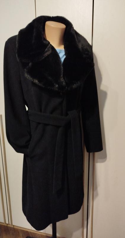 Женское пальто полушерстяное черного цвета с длинными рукавами на пуговицах и с карманами.Пальто с меховым воротником который защелкивается на пуговицы.Есть пасок ПОГ-55 ПОТ-52 ПОС-56 Длина рукава 61 Длина пальто 105
