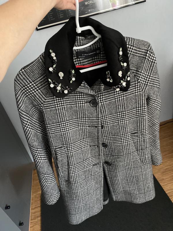 Коротке пальто від 'zara' у гусячу лапку і з великим коміром, що знімається,виготовлене в Марокко. Комір можна зняти. Довжина 82 см Рукав 70 см реглан Ширина під руками 45 Низ ширина 58 5 гудзиків Одягала 2 рази Купувала мені його мама Я його не пристосувала в свій стиль