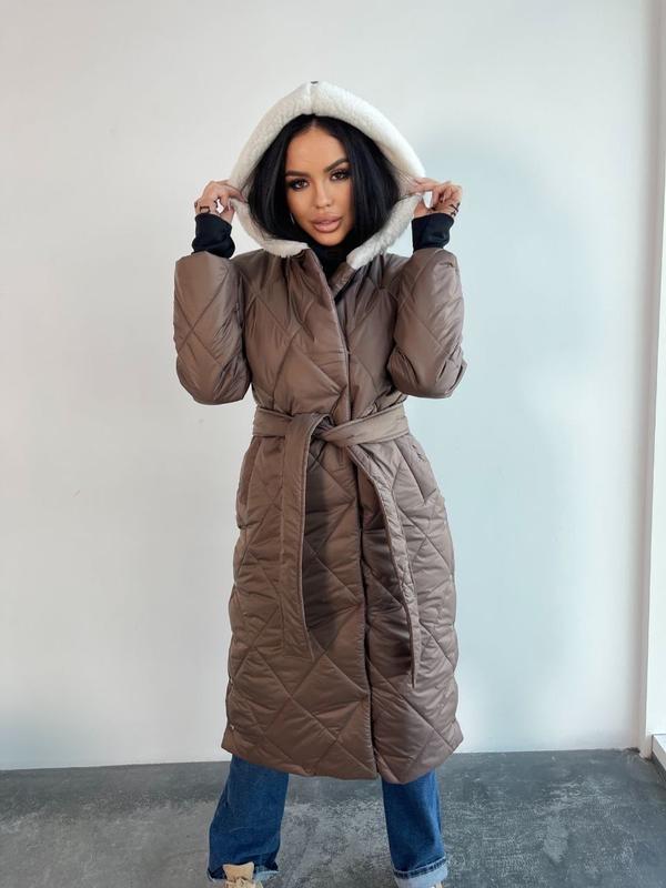 Плащівка стьобана , синтепон 250, еко-хутро Пальто з капюшоном, блискавка двостороння, пояс у комплекті Манжет рукавичка Пальто на блискавці і кнопках Довжина 120см Рукав 74см від горловини По боках кнопки для зручності Розмір 42-44, 46-48, 50-52, 54-56 Колір чорний, шоколад