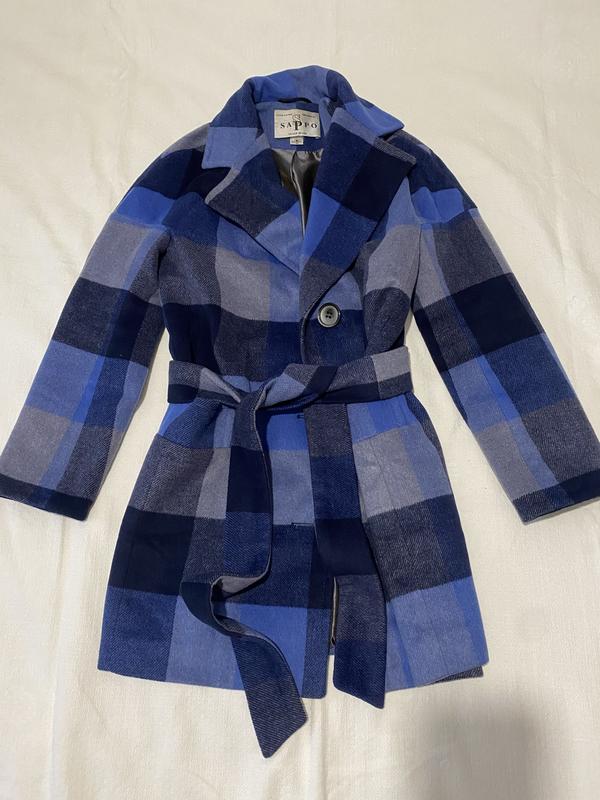 Пальто синього кольору на осінь/весну. В комплекті пояс. Розмір 42, підійде на S. Довжина - 82 см Ширина (під пахвами) - 50 см Із недоліків лише невеличкий блакитний шов під пахвою (фото 4)