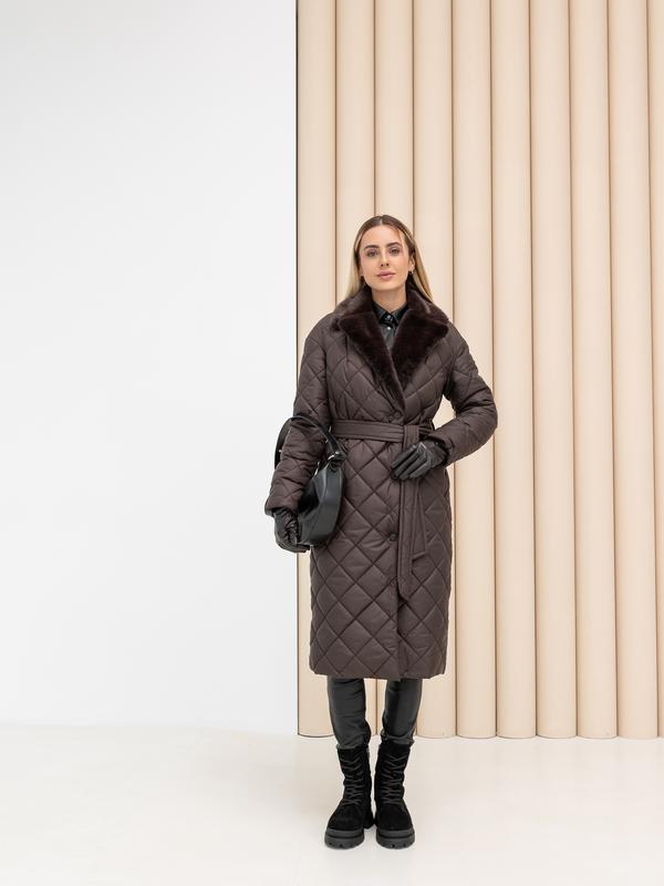 Тепле стьобане зимове пальто з поясом до -10°, жіноче пальто шоколад на зиму, пальто з хут...