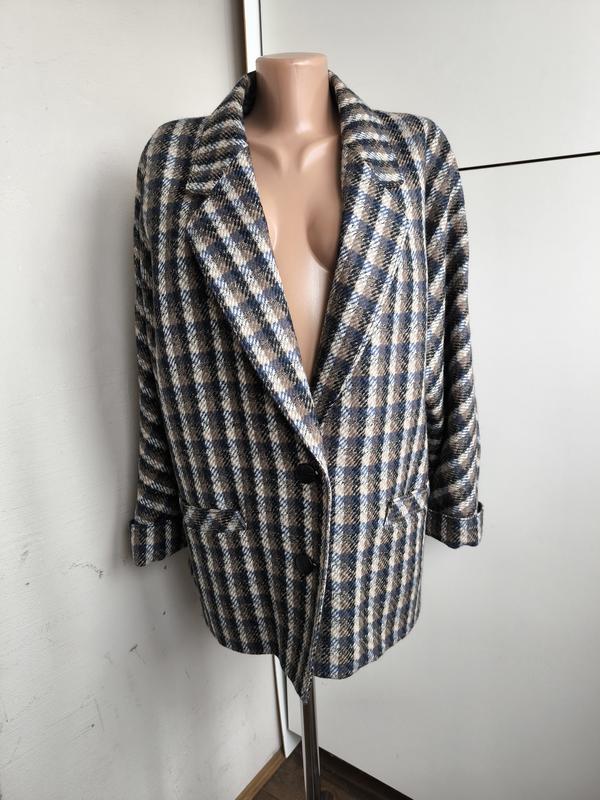 Пальто пиджак из качественной шерсти. Актуальный прямой фасон, очень крутая стильная клетка, можно сочетать со многими цветами. Красиво будет и ремешком, который подчеркнет талию Замеры: Длина: 71 см, Длина рукава от горловины 71 см, ПОГ 60 см, ПОТ 57 см, ПОС 57 см, Ширина внизу 58 см.