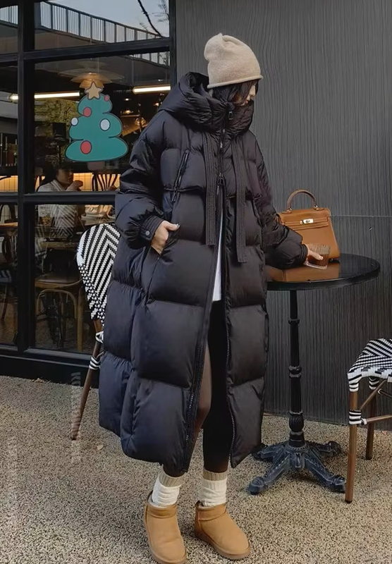 Изготовлено из 100% полиэстерового волокна, это пальто прочное и устойчивое к износу. Капюшон этого пальто обеспечивает дополнительную защиту от холода, что делает его практичным выбором для зимы. Пальто имеет застежку на молнию, что обеспечивает легкое одевание и съемку, сохраняя тепло. Свободный крой этого пальто обеспечивает комфорт и свободу движений, что делает его идеальным для ежедневной носки. Это длинное женское пальто выше колена в корейском стиле с пуховой подкладкой идеально подходит для зимней прохлады. . Пог 54 Рукав 54(от горловины 66) Плечи 52 Длина 100