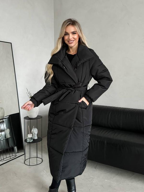 Жіноче тепле зимова стьобане пальто, подовжена куртка демісезонна, з поясом , з утеплюваче...