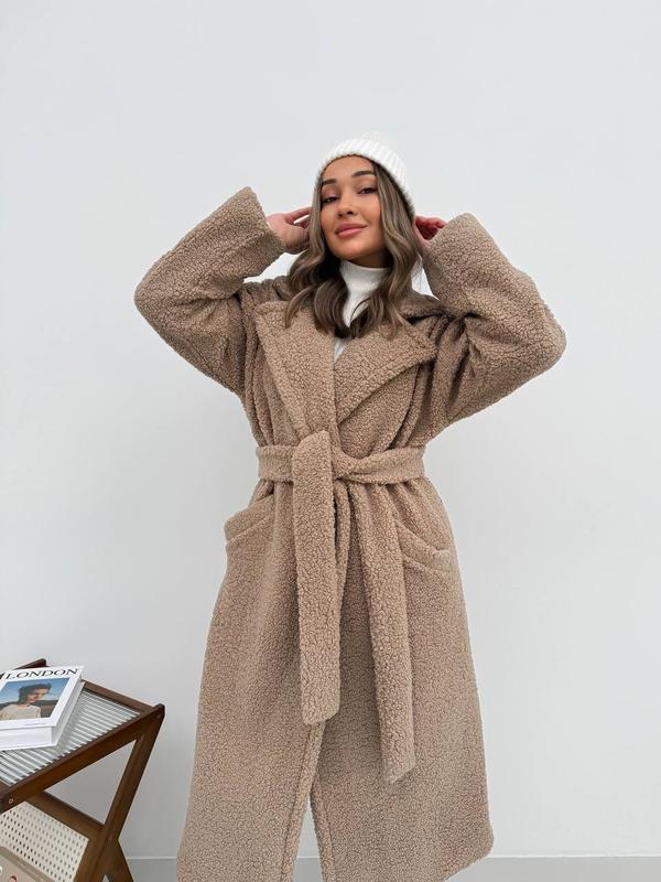 Стильне жіноче довге пальто з теплого еко хутра тедді на підкладці на запах з поясом прямо...