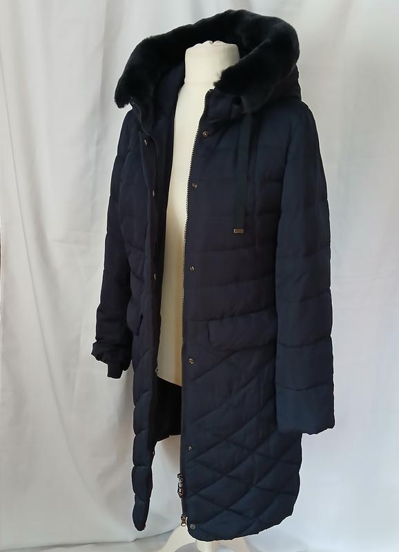 Женское зимне- осеннее пальто удлиненная куртка, темно синяя, с капишоном, натуральным мех...