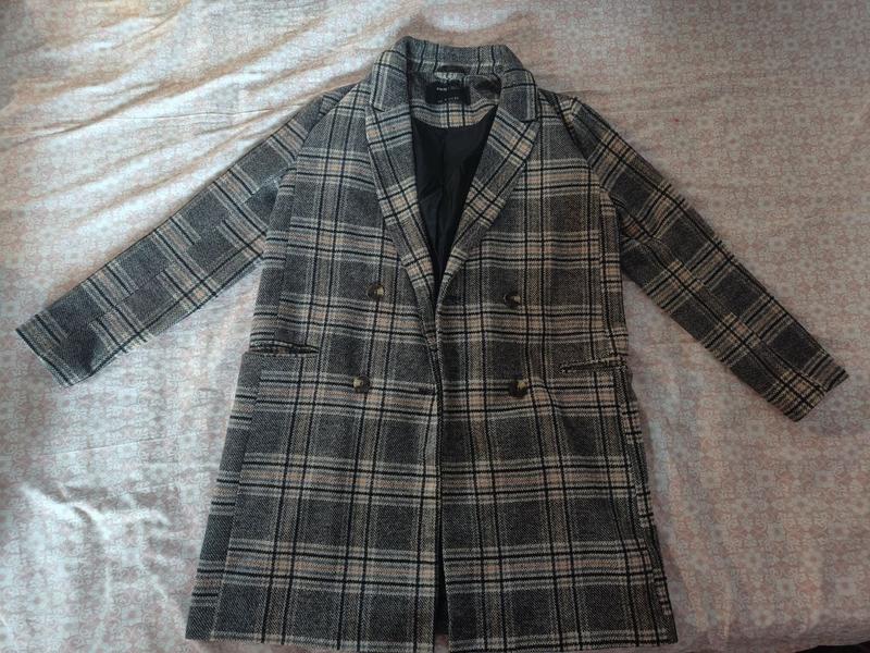 Класне осіннє пальто в клітинку, не приталене, виглядає стильно під будь-який образ:) Довжина рукава (від шва на плечі) 59 см довжина 91 см Стан - ідеальний, майже не носила, бо трошки помилилась з розміром:)