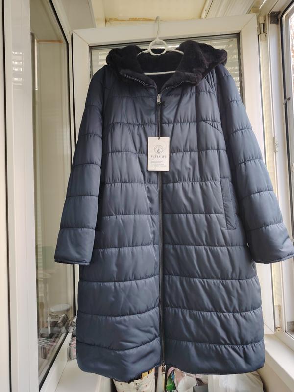 Шикарное оригинальное двухстороннее пальто-шубка темно-синего цвета, шубка под норку, экомех, по бокам есть карманы (с двух сторон), меховой капюшон, со стороны шубки есть поясок. Размер указан 7XL, но смотрите замеры: ПОГ-65 см ПОБ-70 см Длина рукава от горловины - 72 см Длина - 103 см Замеры сделаны поверх изделия. Шарф, палантин в подарок!