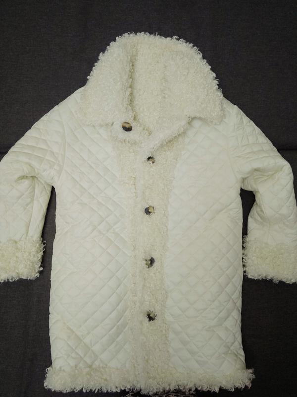 Двусторонняя шуба пальто в iдеальномy cтанi качество хорошее!!!!! Подъемник на л-мин (48-50) полу охват пальто!! поверх!! 58 см зимова цвет молочный Есть карманы из двух сторон.