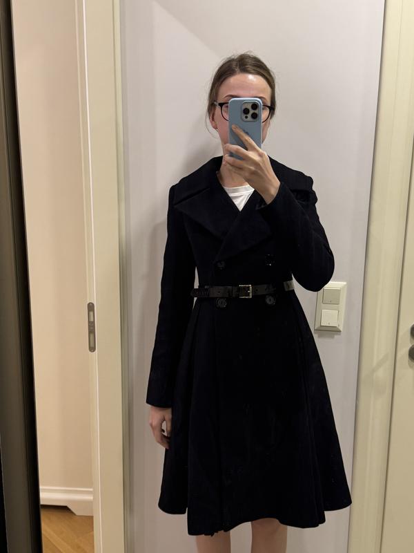 Склад тканини: 75% вовна, 20% поліамід, 5% кашемір. Підкладка: 52% віскоза, 48% ацетат. Догляд: не прати, не вибілювати, не сушити в сушарці, прасувати при низькій температурі, дозволена хімчистка. Довжина рукава 60 см, У мене ріст 175 - на фото, на трішки нижчий ріст буде ще краще. Пальто без утеплювача, але за рахунок тканини тепле і я одягала його до -5. Без ковтунців чи будь-яких інших дефектів. Потрібно буде відпарити і у вас ідеальне нове пальто.