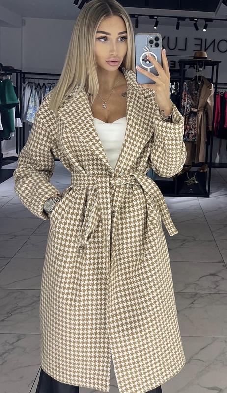 Фактурне кашемірове жіноче пальто кольору кемел в принті «гусяча лапка» середньої довжини під пояс.Пальто на підкладці, демісезон. Дуже мʼяке та ніжне , у складі 80% шерсті . Розмір М(підійде для дівчаток хто носить розмір верху 42-44. Є дефект застібки,треба перешити(представлено на фото)