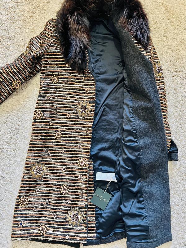 Шикарное дизайнерское подиумное пальто от мэтра испанского Дома Моды Roberto Verino, новое с бирками и ценником 1290 евро ( покупалось лично для себя в Барселоне в бутике Roberto Verino), Эксклюзивная подиумная модель ручной работы! Пальто отшито в единичных экземплярах, из высококачественного шерстяного серого драпа , расшито бисером, пайетками , золотыми нитями и бусинами! Эксклюзивная единичная вещь! Воротник из лисы шоколадно- коричневого цвета с рыжим подтоном, воротник отстёгивается, пальто кнопках, два боковых кармана, сзади шлица. Размер указан S, вполне подходит на М- см замеры на фото . Пальто горит и переливается на свету! Почувствуйте себя королевой в этой шикарной вещи! Пальто Roberto Verino, изображенное на фотографии, имеет следующий вид: • Цвет и узор: Пальто выполнено в горизонтальную полоску из нитей разных цветов, включая черный, золотистый, медный и белый. • Декор: По всей поверхности пальто расположены вышитые цветочные узоры, украшенные бусинами и бисером. • Воротник: Воротник выполнен из темного натурального меха • Фасон: Пальто имеет прямой крой, застегивается на пуговицы и имеет длинные рукава с разрезом внизу Основанный в 1982 году, Roberto Verino - знаменитый испанский дом моды, известный своей непреходящей изысканностью, сдержанной роскошью и безупречным мастерством. Дизайнер Роберто Верино- является основателем Ассоциации творцов Дома Моды Испании