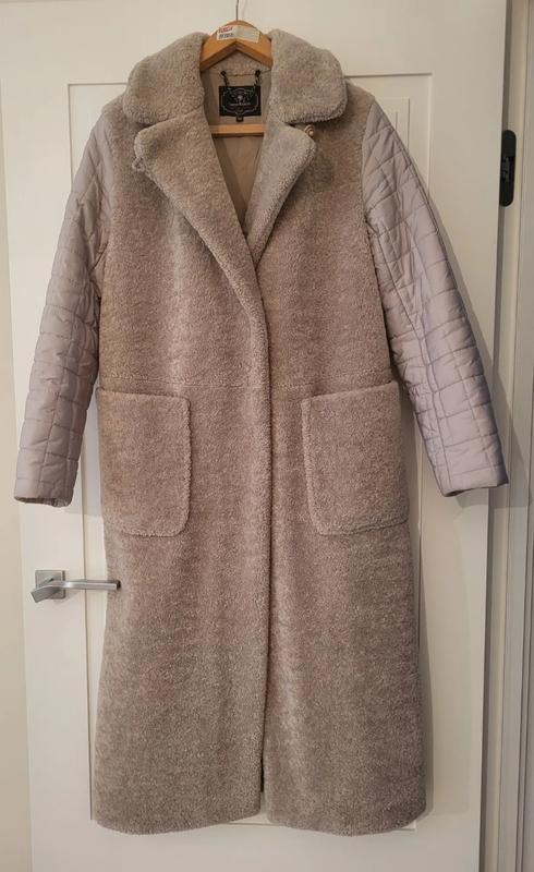 Стильное демисезонное, зимнее пальто в сочетании двух фактур: мягкий искусственный мех «плюш» спереди и стеганая плащевка, ткань сзади и на рукавах. Не дуте Цвет: бежево-коричневый Силуэт: свободный, прямой крой без пояска. На подкладке Два больших накладных кармана спереди Очень удобная и теплая, подходит для прохладной зимы,весны или осени. Нове Размер м,л (44) Длина 121 Пог 52 Рукав 62