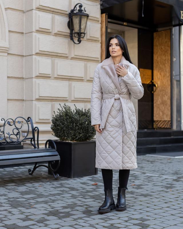 Зимове пальто стьобане жіноче беж з поясом утеплене