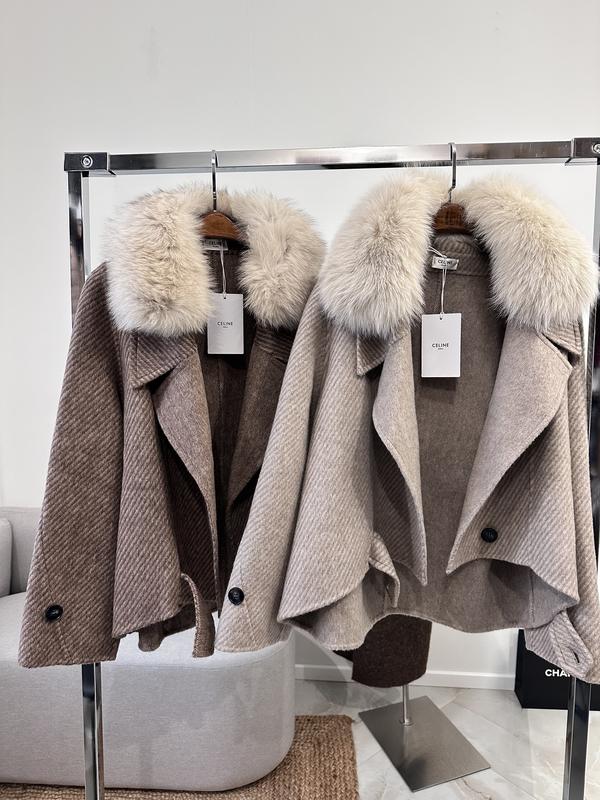 Елегантне вовняне пальто з натуральним хутром. Розкішне пальто преміум-класу, яке поєднує в собі вишуканий стиль і бездоганну якість. Модель виготовлена з м’якої високоякісної вовни з делікатною діагональною текстурою. Акцентом образу є об’ємний комір із натурального хутра світлого відтінку, що додає тепла й елегантності.