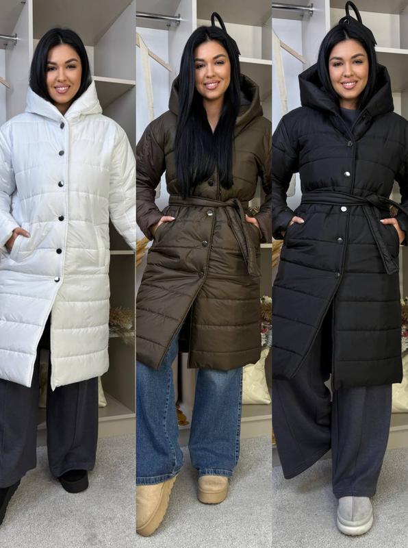 Зимове стьобане пальто, утеплене 200 синтепоном. Большой объемный капюшон, два прорезных кармана и пояс. По спинке украшена кокеткой. АРТ 1056 Цвета черный,шоколад, молоко Размеры: 46/48, 50/52, 54/56, 58/60