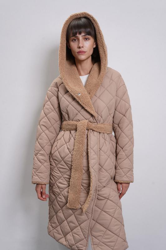 Бежевое стеганое пальто с капюшоном и мехом под овчину